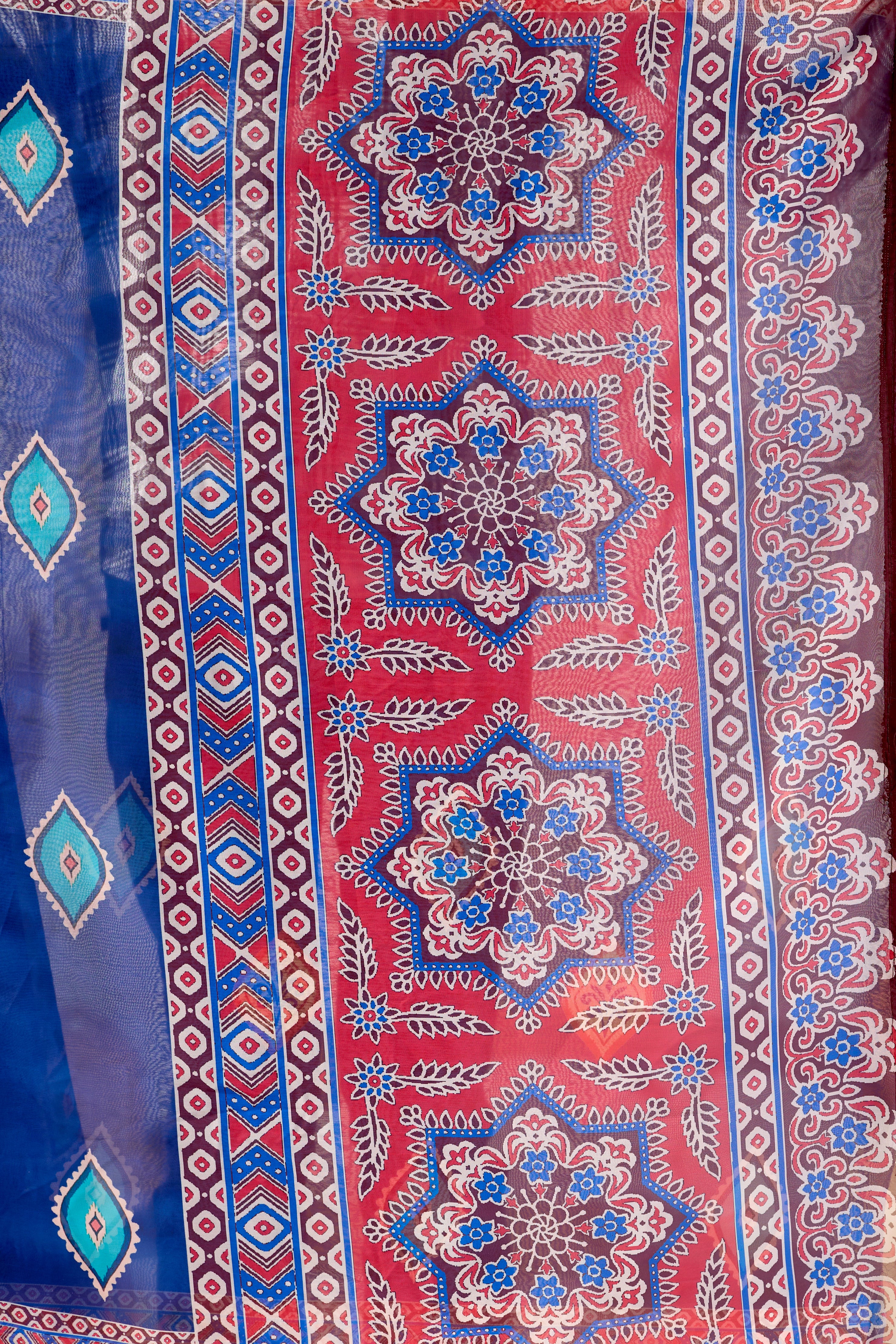 FABRIC: Elegant Soft Georgette Saree in Royal Blue with Contemporary Geometric Digital Prints & Intricate Border Detailing. Beautifully highlighted with contrasting multicolor diamond motifs and a richly designed pallu with tassel finishing (5.5 Mtr Saree).