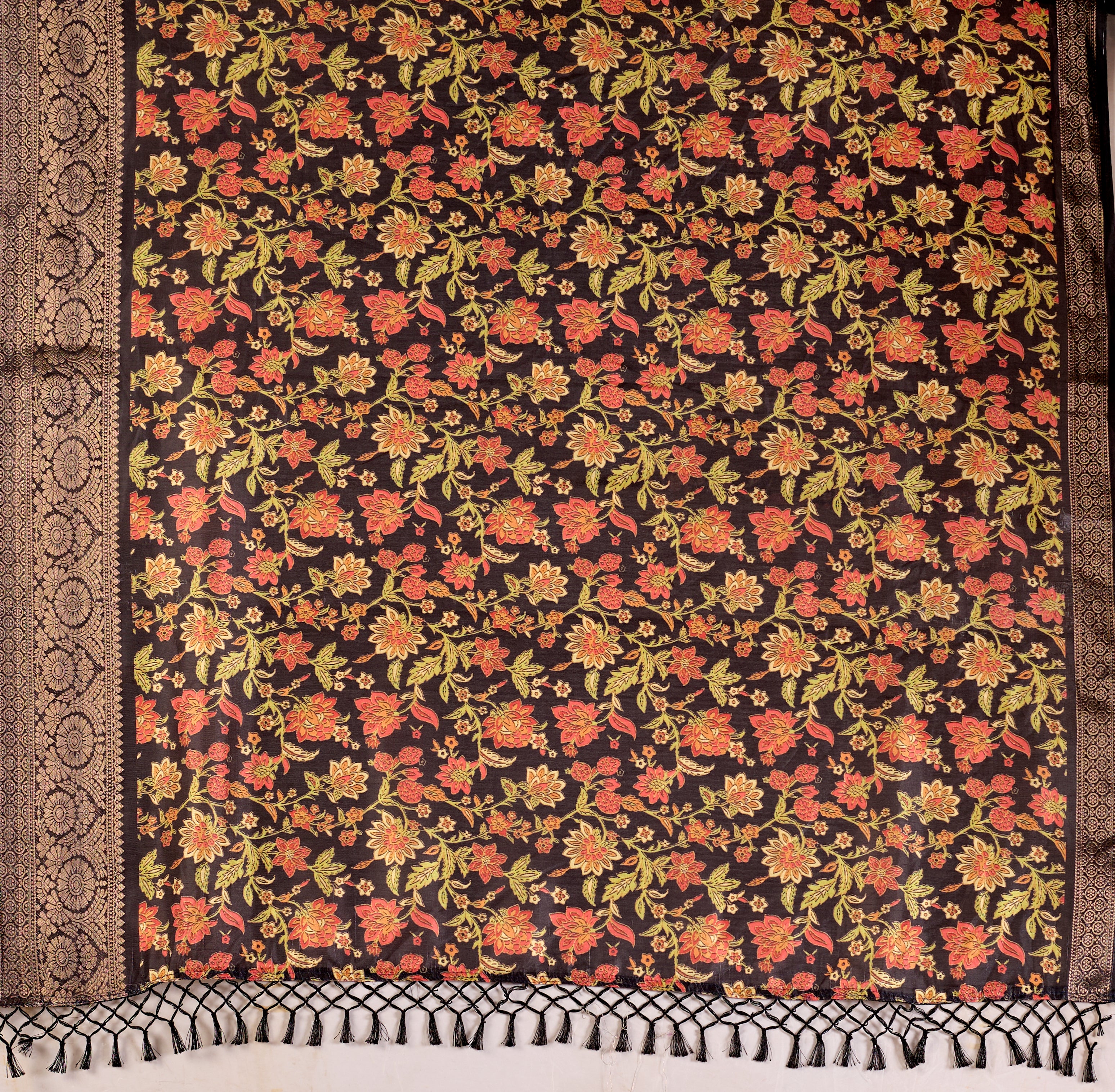 • Exquisite Soft Lichi Silk Saree featuring stunning digital floral motifs on a rich black base