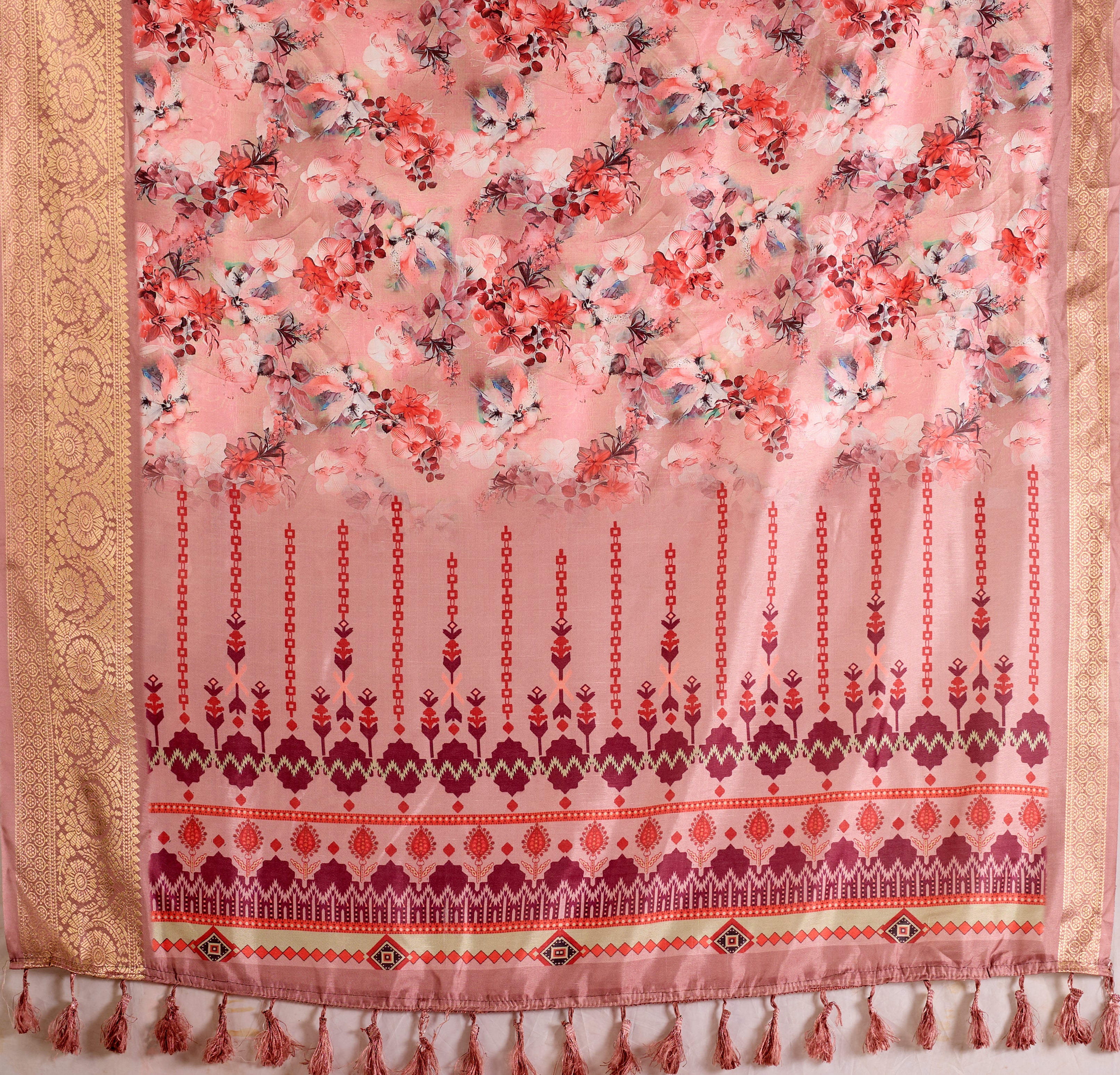 Gorgeous Soft Lichi Silk Saree with enchanting digital floral prints and a rich golden zari border