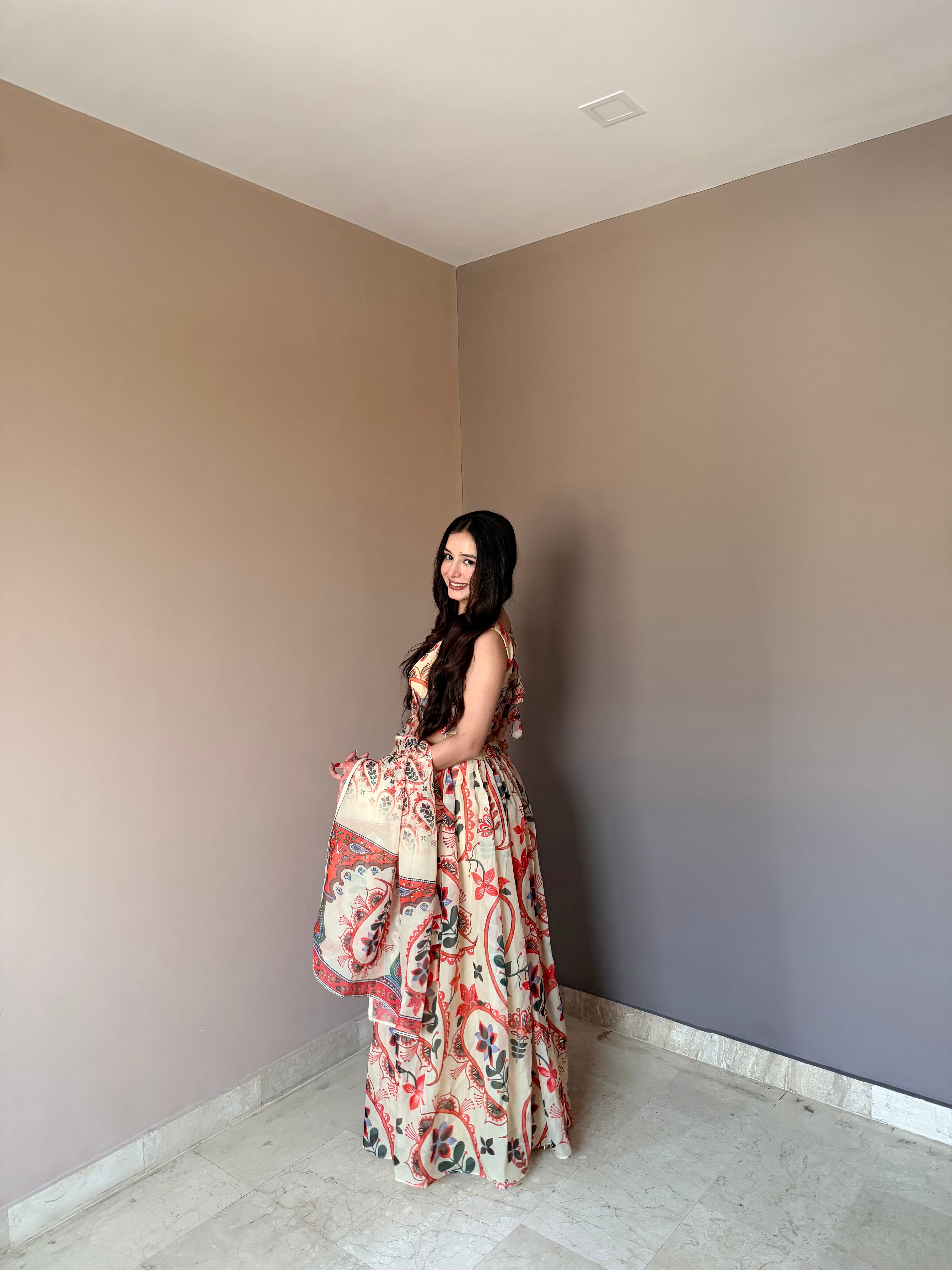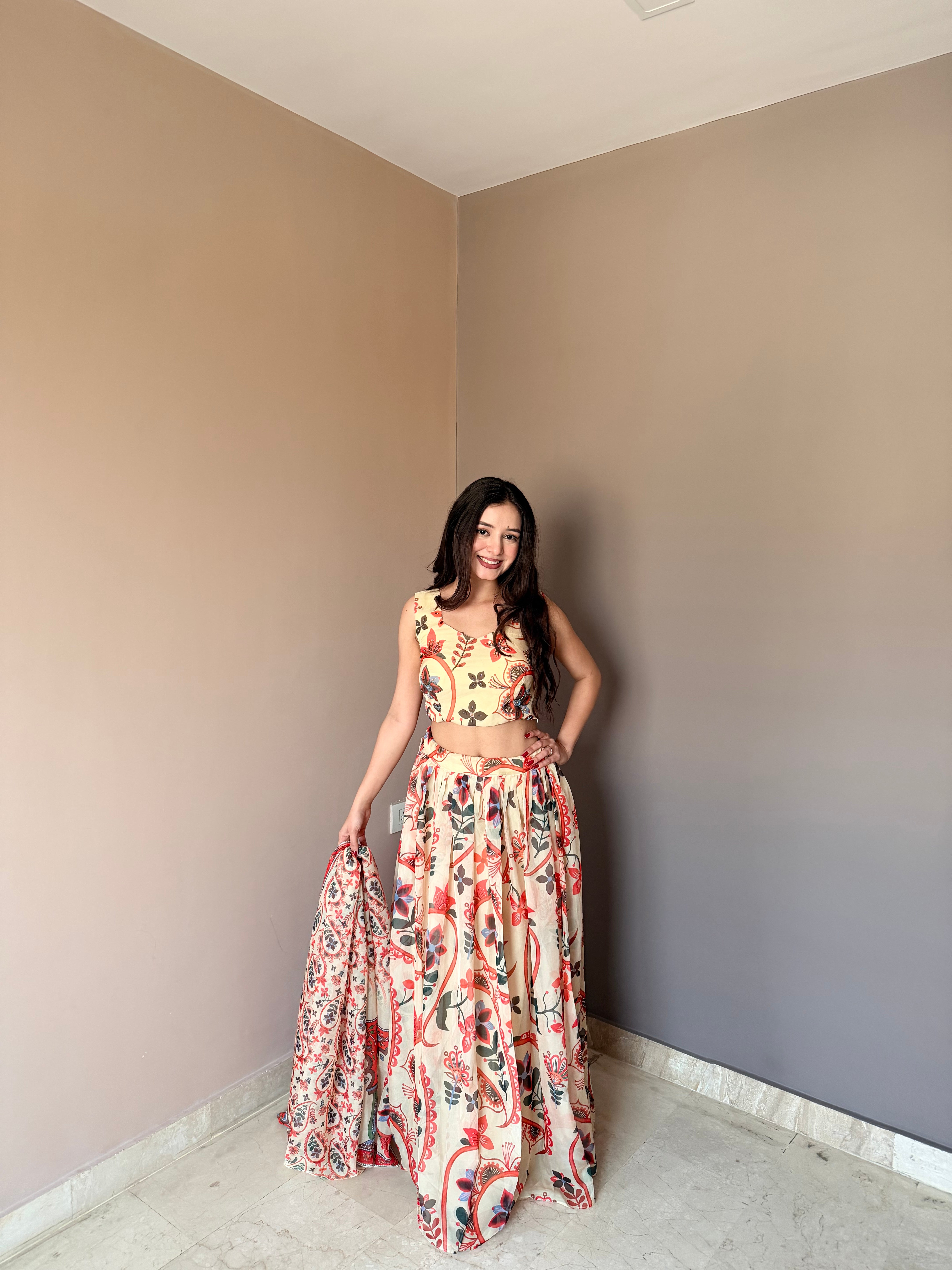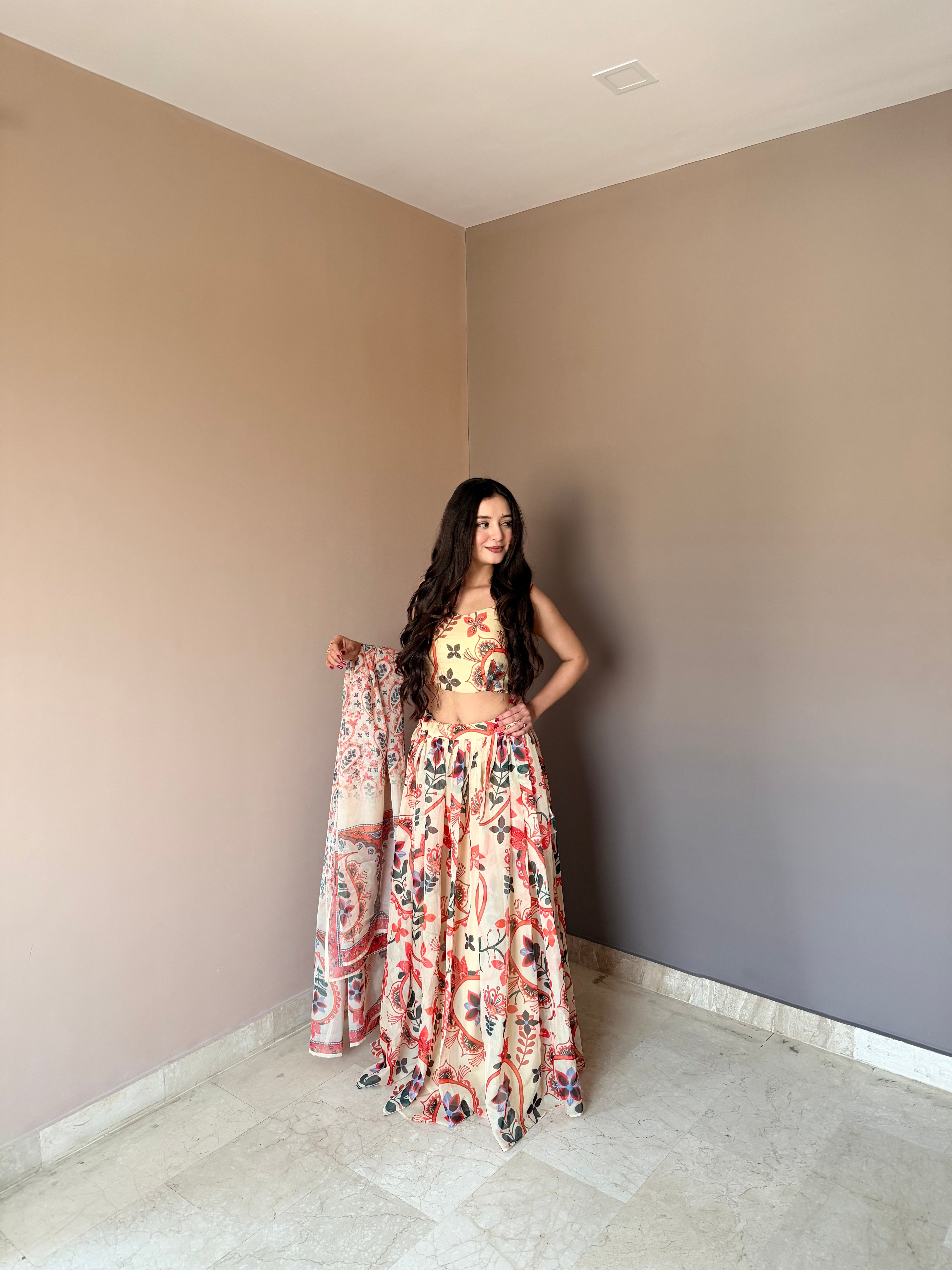 Lehenga – Beautiful all-over floral printed lehenga with rich multi-panel flair, approx. 4.5 mtr flair, comfortable elastic waist & graceful fall