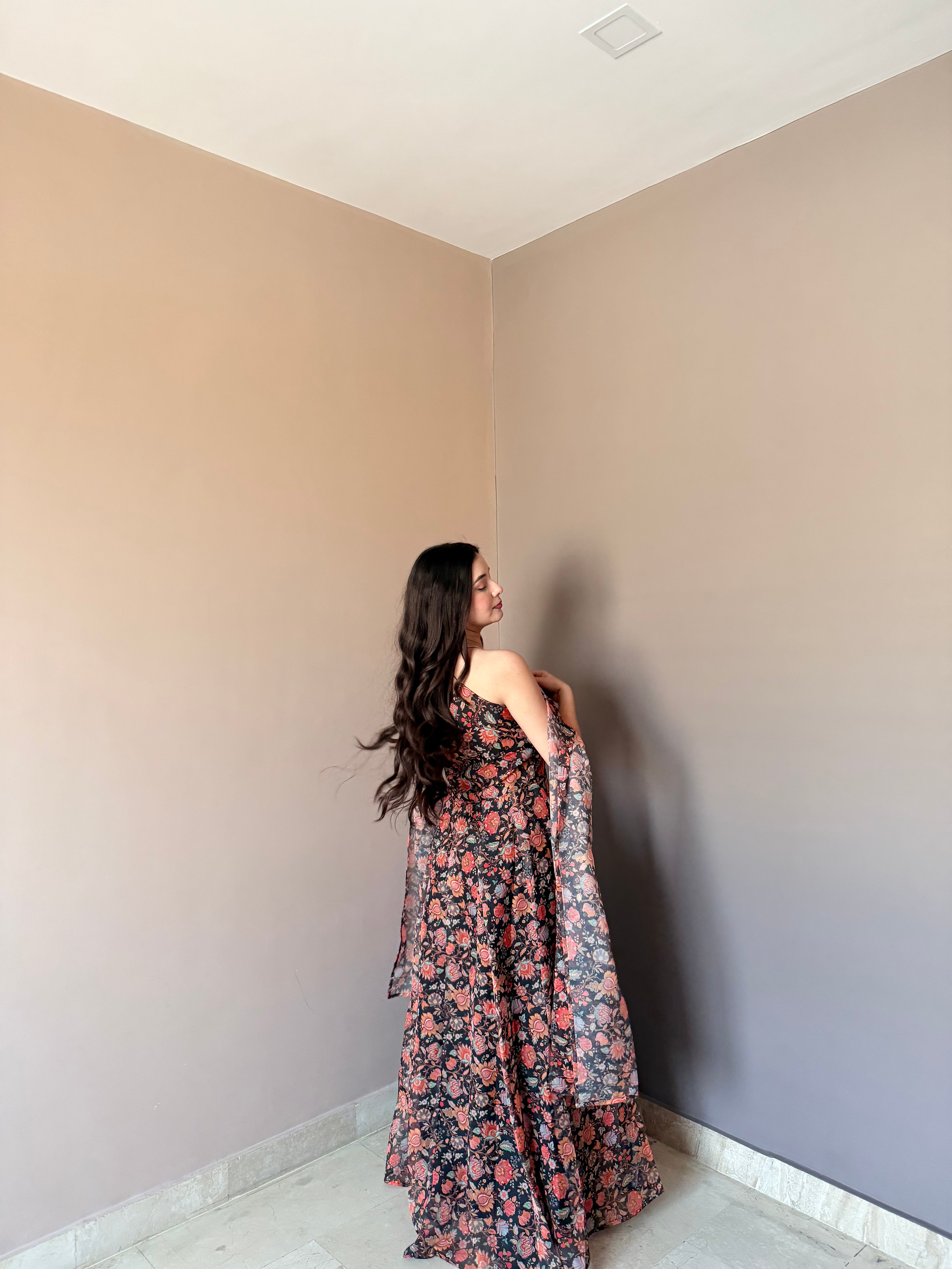 • Premium Floral Printed Organza Gown Set with Matching Dupatta