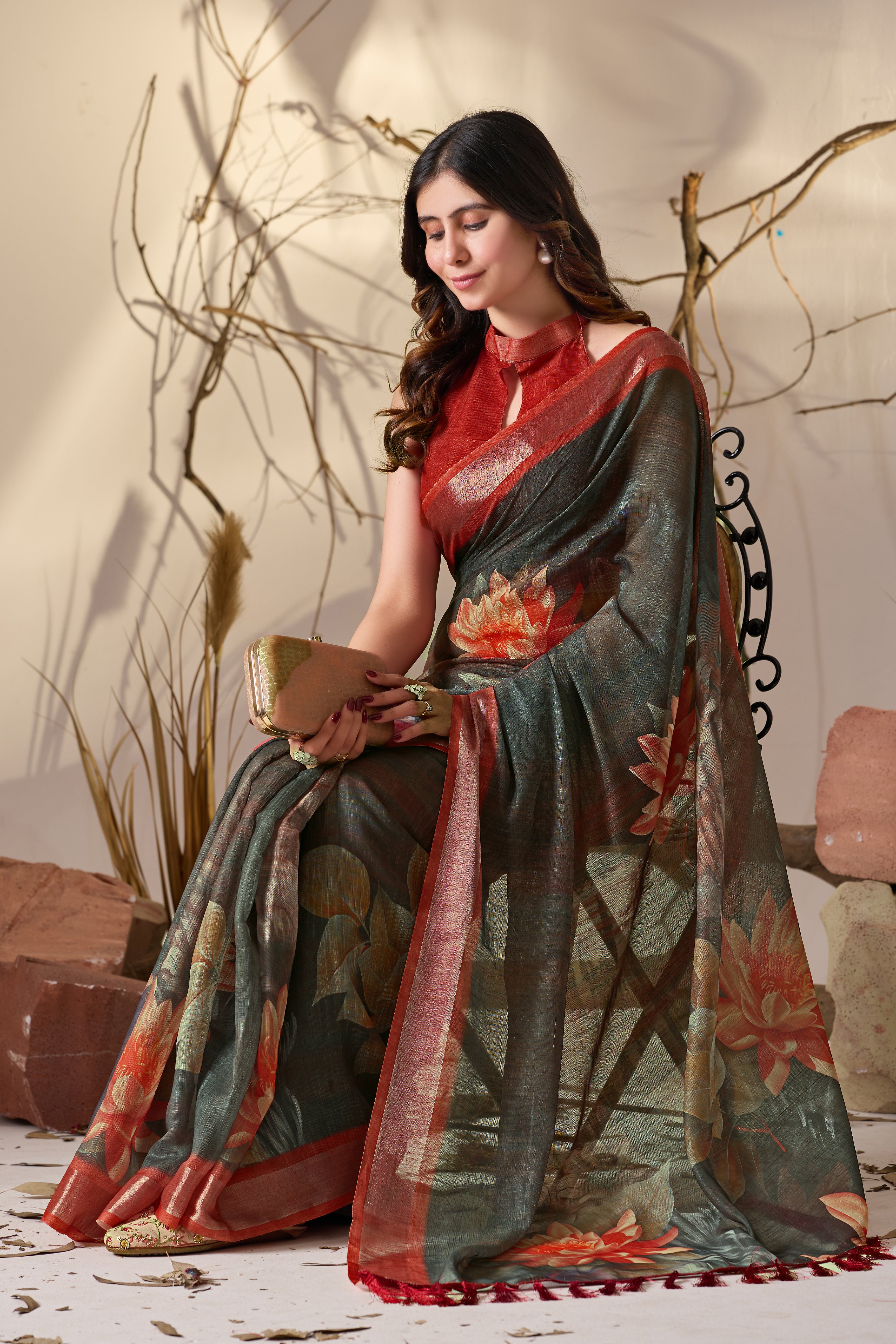 Premium Linen Cotton Saree with Artistic Dark Shade Floral Digital Print & Elegant Rust Red Border with Tassel Detailing