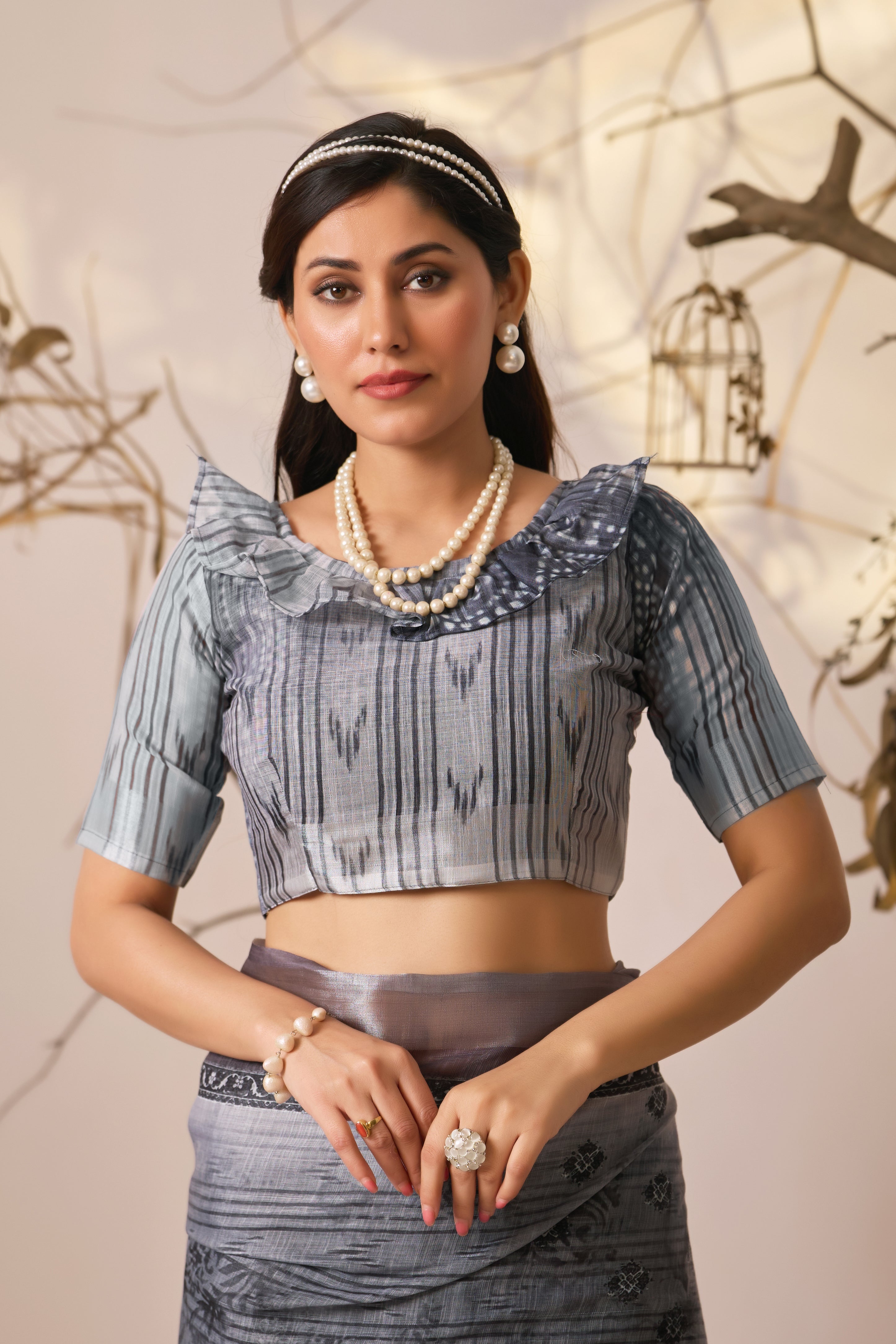 • Premium Linen Cotton Saree with Elegant Digital Floral & Royal Ethnic Print & Classic Contrast Patola Style Border