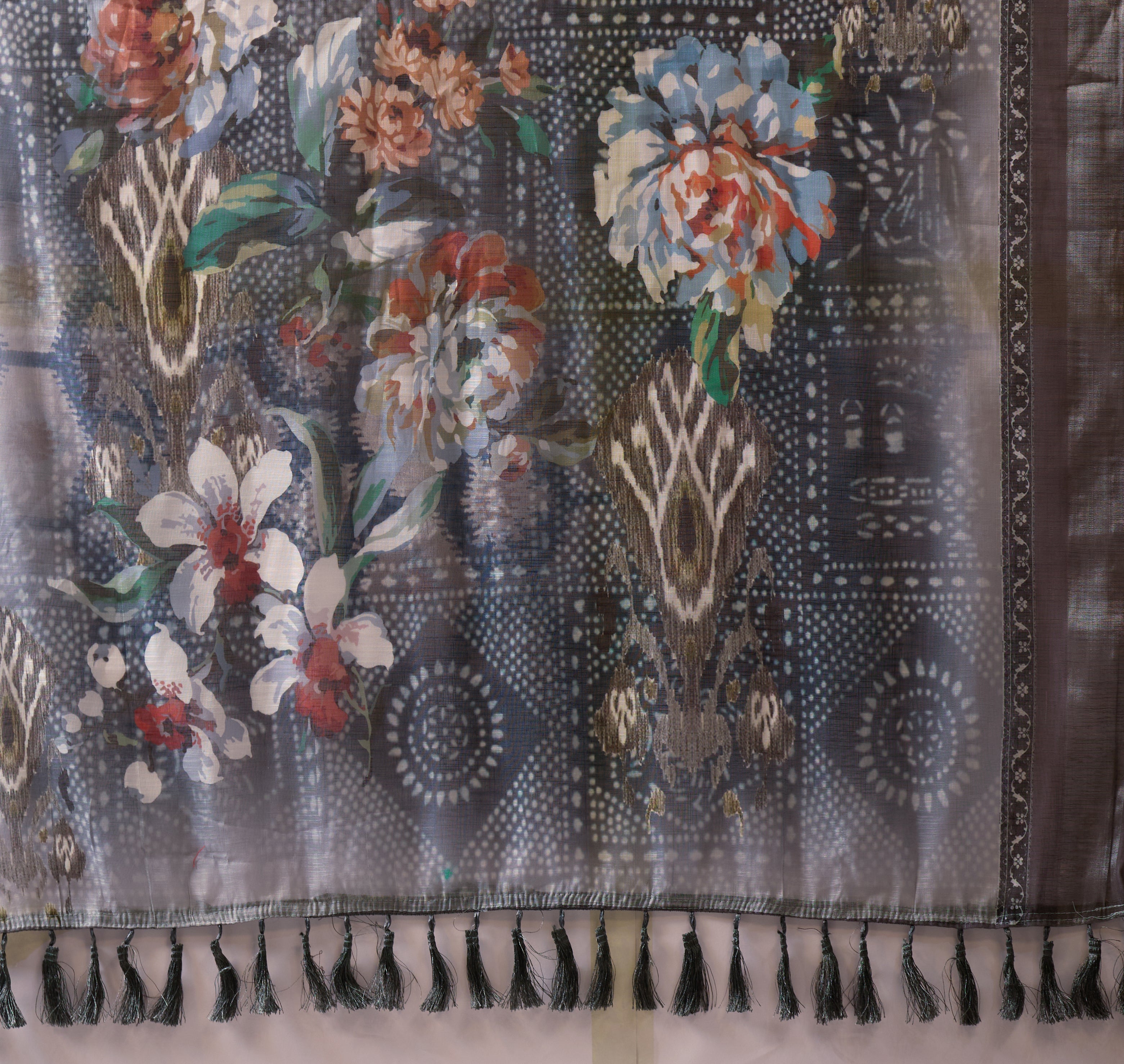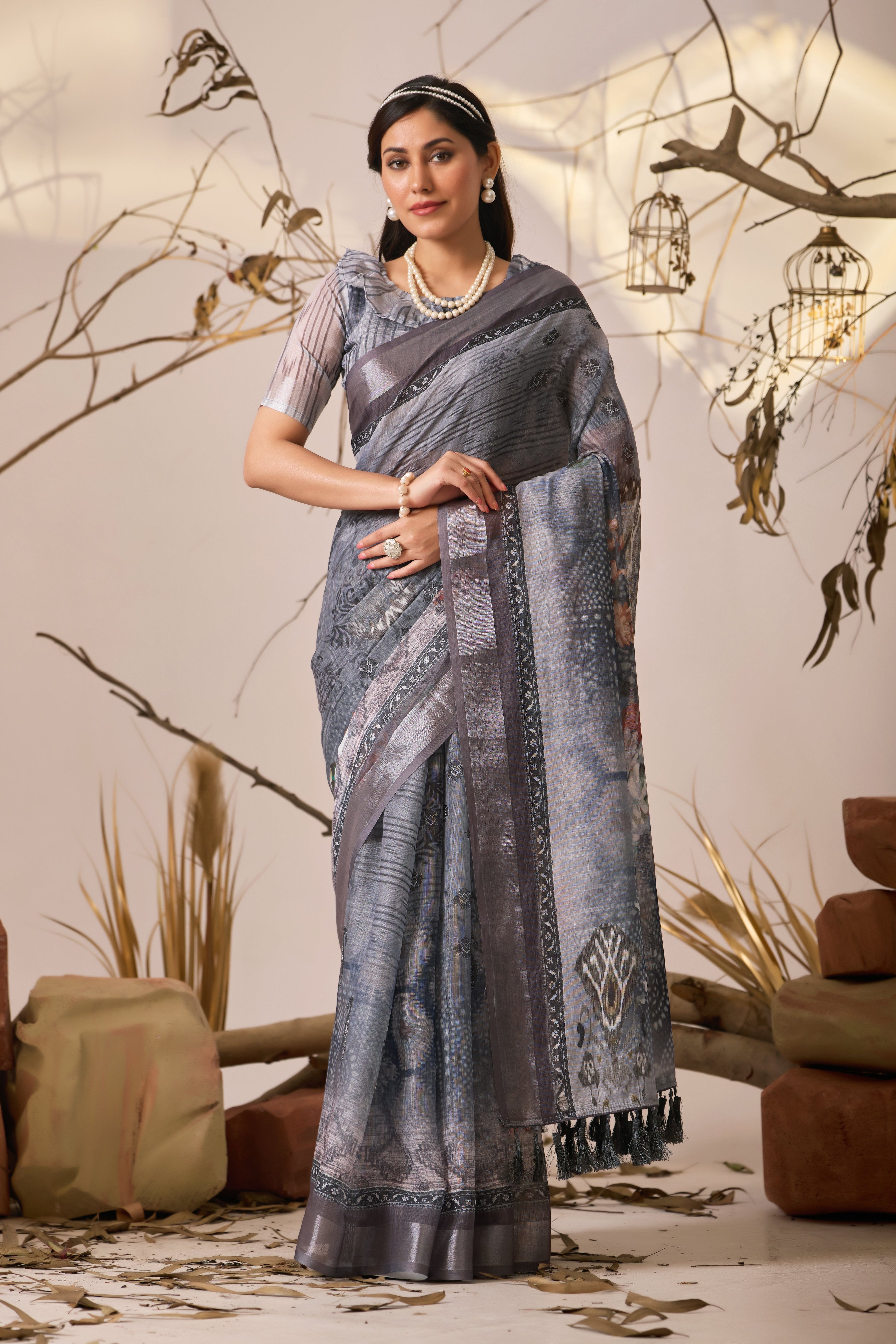 Premium Linen Cotton Saree with Elegant Digital Floral & Royal Ethnic Print & Classic Contrast Patola Style Border