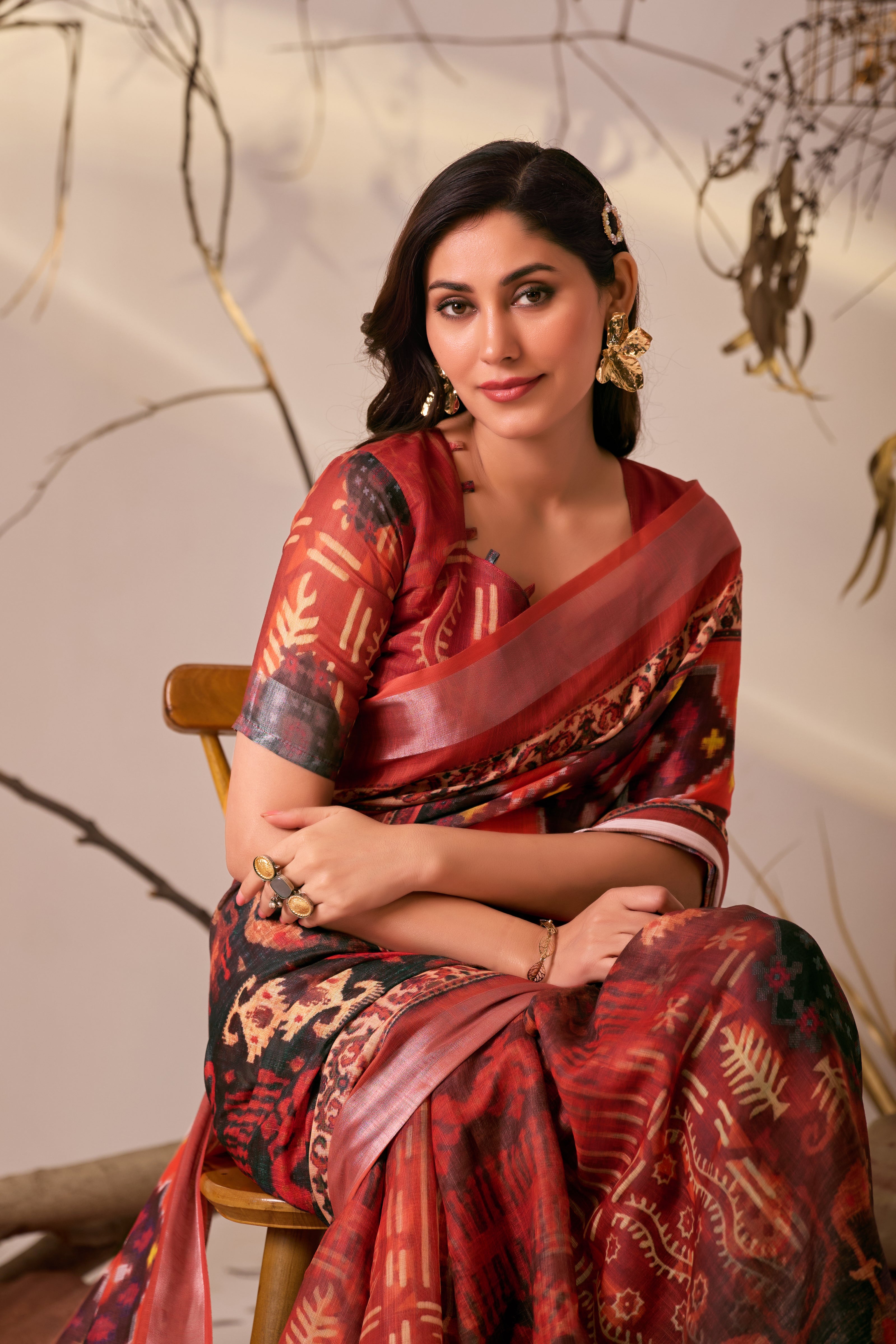 Premium Linen Cotton Saree with Rich Ikat Digital Print & Elegant Patola Style