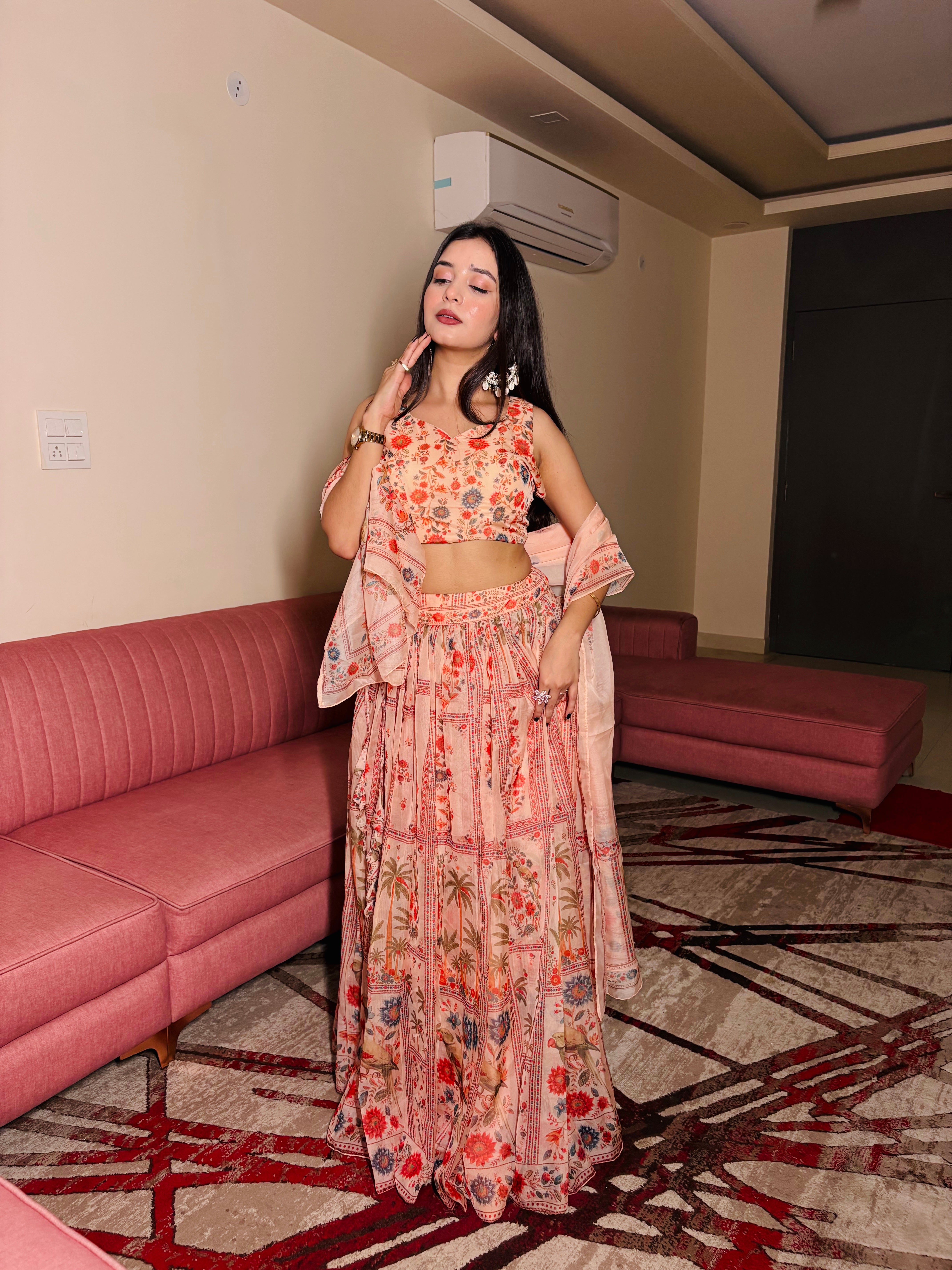 Lehenga – Pure organza fabric with multi-panel floral print, approx. 4.5 mtr flair, comfortable elastic waist & perfect fall