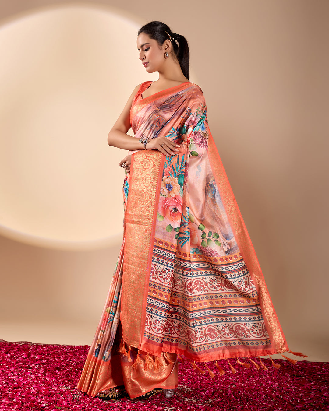 Soft Lichi Silk Saree adorned with elegant floral patterns and intricate Patola-inspired pallu, complemented by a luxurious zari woven border