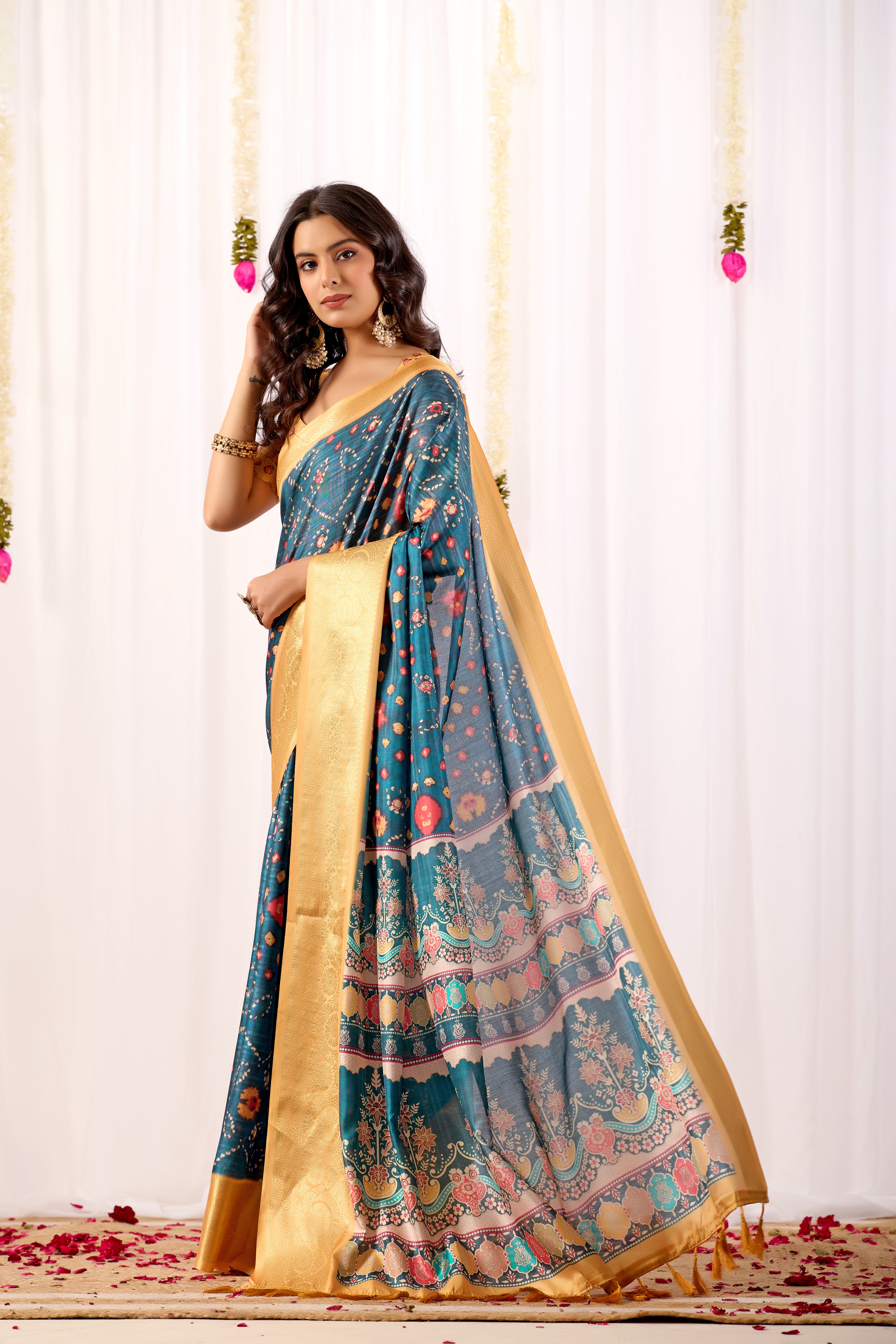 Gorgeous Soft Lichi Silk Saree featuring enchanting digital floral prints on a rich smoky grey base with an intricate golden zari border