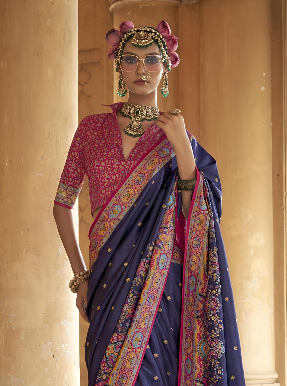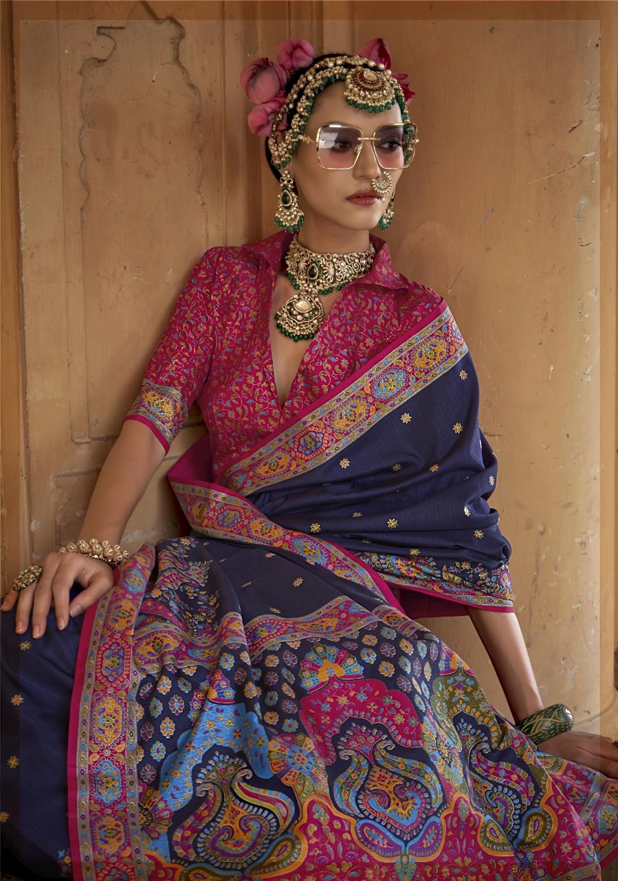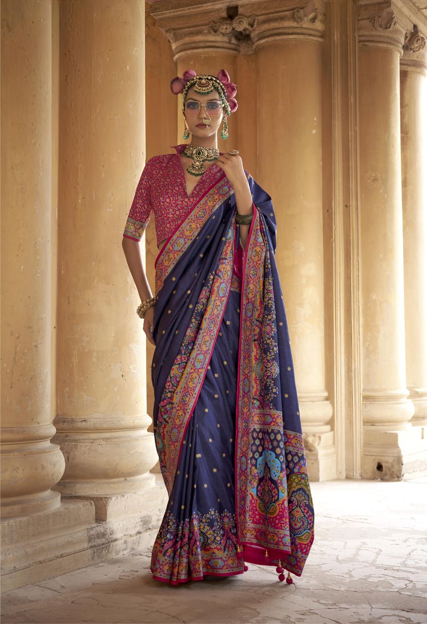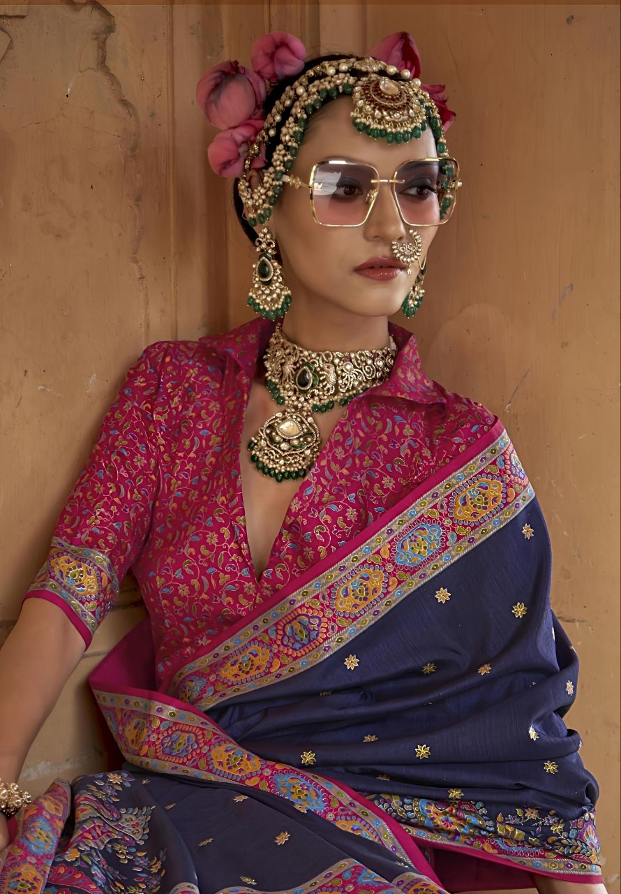 Majestic Midnight Blue Patola Printed Saree with Rich Pink Designer Blouse